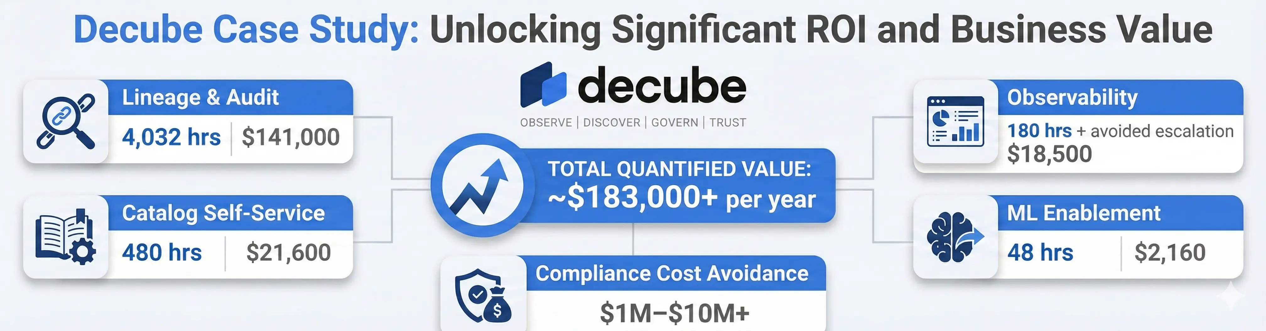 Enterprises are increasingly searching for ways to quantify the ROI of data lineage, observability, and data governance initiatives. This case study highlights how Decube’s Data Trust Platform helps organizations save thousands of engineering hours, reduce compliance costs, and build AI-ready pipelines. By unifying metadata, lineage, quality signals, and auditability into a single context layer, Decube delivers measurable operational efficiency and long-term financial value.
